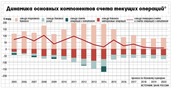 В последнем докладе о денежно-кредитной политике ЦБ повысил прогноз положительного сальдо текущего счета в 2017 г. до $37 млрд: регулятор ожидал более высокого профицита торгового баланса в связи с ростом цен на нефть. Но в 2018–2019 гг. баланс внешней торговли ухудшится и профицит текущего счета сократится, прогнозировал ЦБ, а в 2020 г. стабилизируется немного ниже $10 млрд.