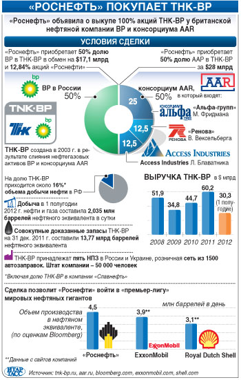 В сообщениях «Роснефти» и AAR отмечается, что стороны уже подписали меморандум о намерениях. По словам Игоря Сечина, сделка по приобретению всей компании ТНК-ВР может быть закрыта в течение полугода. Впрочем, это при условии наибольшего благоприятствования регуляторов и «напряженной работы». После поглощения ТНК-ВР «Роснефть» станет крупнейшей компанией в мире по объему добычи (около 4,2 млн баррелей в день) и запасам (около 23 млрд баррелей), а Игорь Сечин, которого еще недавно сочувственно провожали в отставку с поста вице-премьера правительства, возглавит новое национальное достояние России.