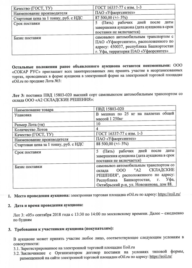 В связи с плановыми ремонтными работами ПАО «Уфаоргсинтез» на производстве полиэтилена высокого давления в сентябре 2018 года, ООО «СОКАР РУС» извещает о снятии Лотов №1 и №2 с аукциона, проводимого в рамках извещения №01-03 от «3» августа 2018 года.