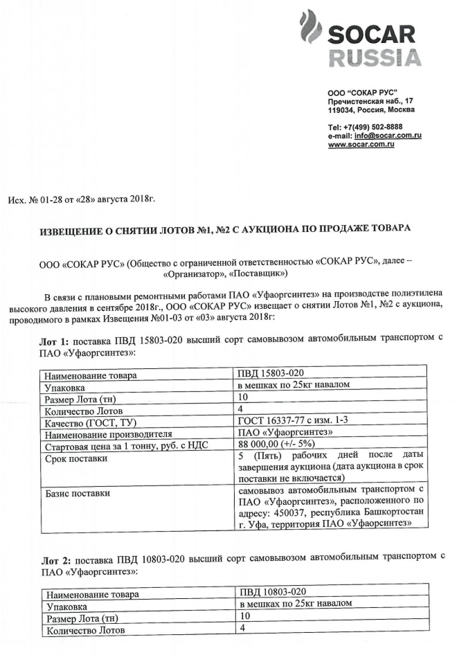 В связи с плановыми ремонтными работами ПАО «Уфаоргсинтез» на производстве полиэтилена высокого давления в сентябре 2018 года, ООО «СОКАР РУС» извещает о снятии Лотов №1 и №2 с аукциона, проводимого в рамках извещения №01-03 от «3» августа 2018 года.