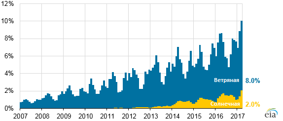 В прошлом году благодаря ветряной и солнечной энергетике было сгенерировано 7% электрической энергии Соединенных Штатов. К марту 2017 г. этот объем повысился еще на 3 процентных пункта. Пока это всего лишь месячные показатели, однако тенденция на лицо.