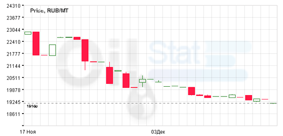 Оптовые цены на российском рынке нефтепродуктов продолжают снижаться. Основной причиной понижения цен также остается дисбаланс конъюнктурных факторов. Низкий уровень спроса на основные виды топлива, прежде всего связанный с сезонным фактором, не соответствует высокому уровень предложения практически по всему спектру нефтепродуктов. Исключением на данный момент является зимний сорт дизельного топлива. Популярность этого продукта у потребителей резко выросла в связи со сложившимися в последние дни погодными условиями: сильное похолодание заставило покупателей приобретать именно этот вид дизтоплива, а повышенный интерес подтолкнул некоторых производителей скорректировать стоимость дизеля в сторону повышения. Наступление морозов может дать рынку возможность наблюдать стабилизацию стоимости зимнего дизельного топлива до конца года.