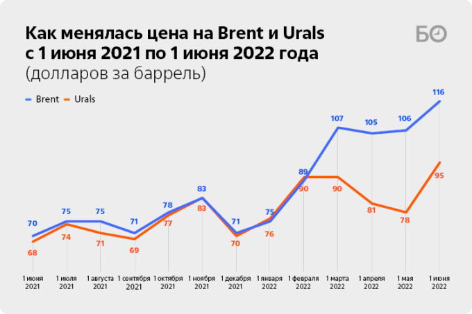 После начала спецоперации котировки Вrent пошли резко вверх, с конца февраля и до июля 2022-го нефть стоила более $100 за баррель, а в пике превышала до $120 за бочку. С другой стороны, из-за вводимых против нашей страны санкций внутренние цены, по которым российские нефтяные компании могли продать свою нефть (Urals), не только не выросли, а даже стали падать. С марта по май прошлого года спотовые цены на Urals несколько раз уходили ниже $70 за баррель.