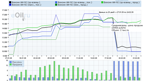 23 февраля на Торговой площадке eOil.ru стоимость бензина марки Аи-92 выросла. Так, средневзвешенная цена продажи увеличилась на 329 руб./т. и составила 15 950 руб. за тонну, объем предложения сократился на 0,8 тыс. тонн до отметки 2 тыс. тонн. Средневзвешенная цена покупки осталась на прежнем уровне и составила 10 500 руб. за тонну, объем спроса также не изменился и составил 15 тыс. тонн.