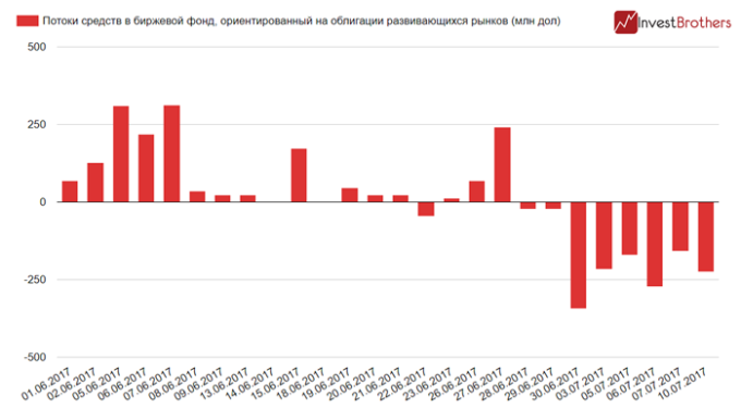За восемь рабочих дней инвесторы изъяли из ETF EMB более 1,4 млрд долларов. Данный отток может сигнализировать о начале вывода средств с развивающихся рынков.