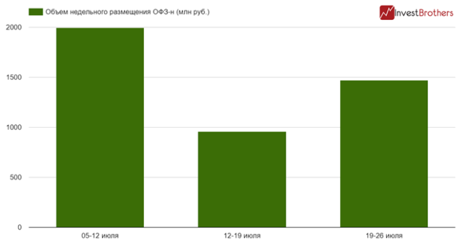 За неделю с 19 по 26 июля Минфин разместил ОФЗ-н на сумму в 1,5 млрд рублей, что на 500 млн больше, чем неделей ранее.