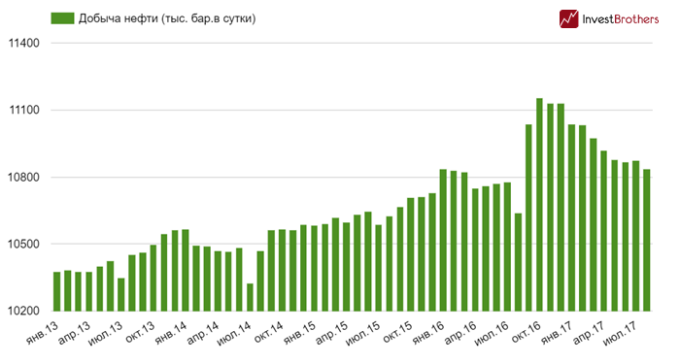 По итогам последнего месяца лета 2017 г. среднесуточная добыча “черного золота” в России упала до 10,84 млн баррелей.