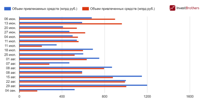 Центральный банк привлек на один день 169 млрд рублей, хотя хотел 520 млрд.