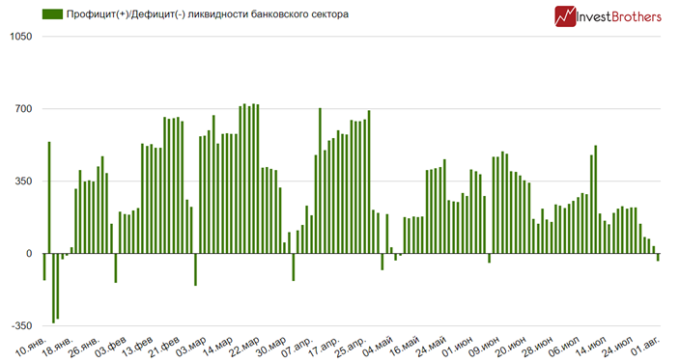 На начало рабочего дня 01 августа дефицит ликвидности банковского сектора страны достиг 38,7 млрд рублей.