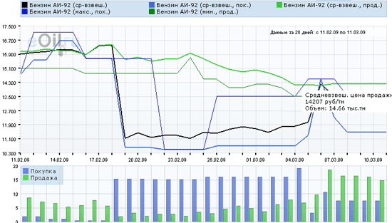 10 марта на Торговой площадке eOil.ru стоимость бензина марки Аи-92 практически не изменилась. Так, средневзвешенная цена продажи сократилась на 16 руб./т. и составила 14 207 руб. за тонну, объем предложения уменьшился на 1,38 тыс. тонн до отметки 14,66 тыс. тонн. Средневзвешенная цена покупки осталась на прежнем уровне 11 464 руб. за тонну при стабильном объеме спроса 7,5 тыс. тонн.