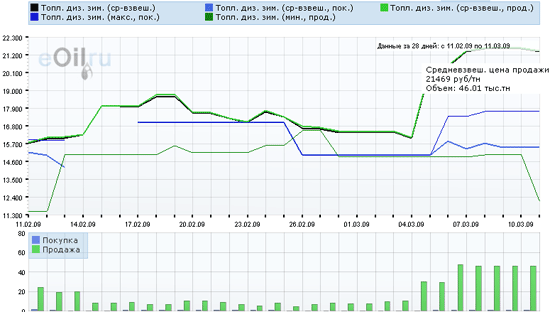 10 марта на Торговой площадке eOil.ru стоимость дизтоплива зимнего уменьшилась. Стоимость продажи сократилась на 181 руб./т. и составила 21 469 руб. за тонну, объем предложения увеличился на 0,18 тыс. тонн и составил 46,01 тыс. тонн. Средневзвешенная цена покупки не изменилась и сохранилась на уровне 15 450 руб. за тонну при стабильном объеме спроса 0,36 тыс. тонн.
