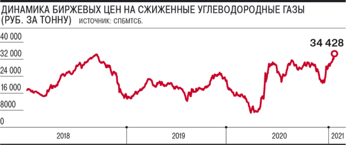 Стоимость сжиженных углеводородных газов (СУГ) на Санкт-Петербургской международной товарно-сырьевой бирже (СПбМТСБ) выросла 9 февраля на 7%, до 34,4 тыс. руб. за тонну, обновив исторический максимум 2018 года, свидетельствуют данные торгов. С начала декабря 2020 года цена на СУГ увеличилась более чем на 60%. Динамика цен на СУГ повторяет изменение цен бензина, которые в этом году достигли максимума на фоне увеличения привлекательности экспорта. СУГ используется как для бытовых нужд, так и в качестве автомобильного топлива.