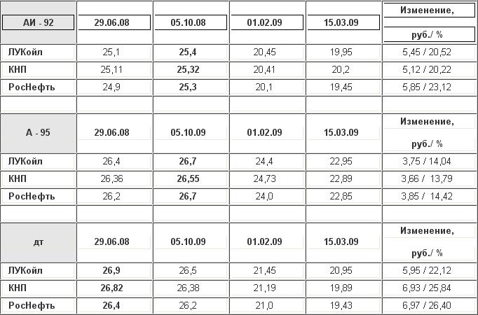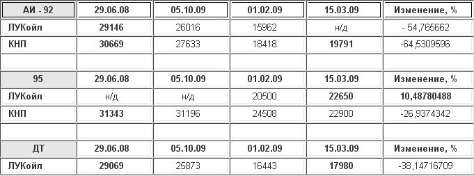 По сообщению сотрудников Калининградского управления федеральной антимонопольной службы, за полгода, с октября 2008 по март 2009 года, розничные цены на бензин АИ-92 снизились от 5,12 до 5,85 руб./литр, то есть более, чем на 20%. На бензин АИ-95 — от 3,66 до 3,85 руб./литр, т.е. почти на 14%. Дизельное топливо упало в цене от 5,95 до 6,97 руб./литр, т.е. На 22 до 26%.