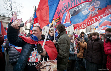 Со сцены митинга доносятся слова байкера «Хирурга»: «Призываю сплотиться вокруг президента России. Оранжевый хорек обломает о нас свои гнилые, но ядовитые зубы!» Но люди в толпе, похоже, смотрят на вещи гораздо спокойнее. «Война всегда будет выгодна верхним силам, а люди всегда будут от нее страдать и войну останавливать», — рассуждает студент-чеченец: он идет на митинг под флагом Чечни. Чеченцев целая колонна: с эмблемами движения «Ахмат», с портретами Ахмата Кадырова на куртках.