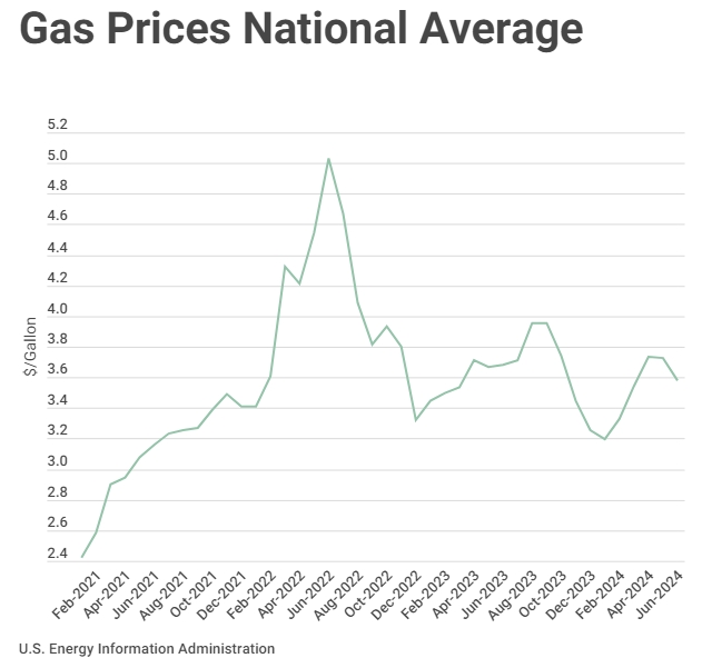 Цены на бензин в среднем по стране ($/галлон). Управление энергетической информации США, июнь 2024 г.