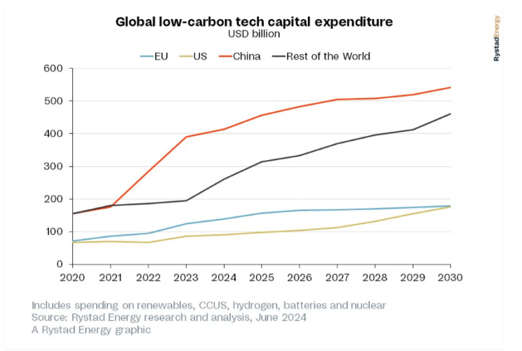 В 2023 году капитальные вложения (CAPEX) блока в чистые технологии, включая возобновляемые источники энергии, технологии улавливания, хранения и использования углерода (CCUS), водород, аккумуляторы и ядерную энергетику составили 125 млрд долларов, что значительно меньше 390 млрд долларов, которые инвестировал Китай в те же сектора. В настоящее время США отстают от ЕС по ежегодным расходам на экологически чистые технологии, вложив в 2023 году 86 млрд долларов. Однако, закон «О снижении инфляции» призван стимулировать инвестиции, в то время как расходы ЕС в ближайшие годы останутся на прежнем уровне. В 2030 году США практически сравняются с Европой по общему объему расходов на чистую энергетику, а в последующие годы обгонят ее.