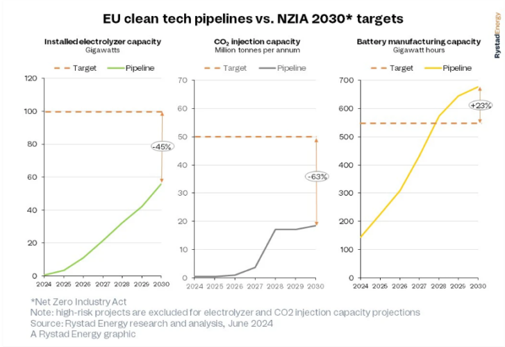 Установленная мощность чистых технологий в ЕС в сравнении с целевыми показателями NZIA 2030 года Источник: Rystad Energy