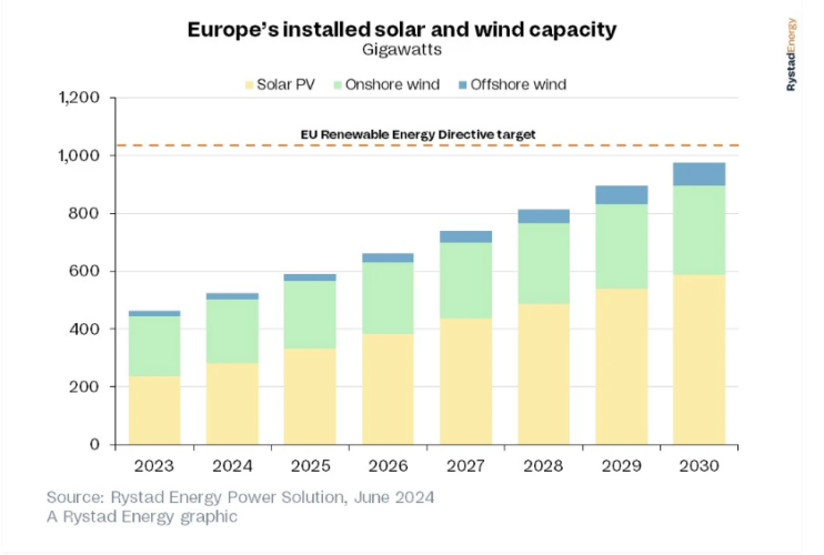 Установленная мощность солнечной и ветровой энергетики в Европе Источник: Rystad Energy