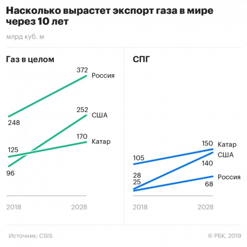 Россия сохранит первое место в мире по общему экспорту газа, пишет Цафос. В 2018 году Москва экспортировала 248 млрд куб. м (из них 25 млрд куб. м — СПГ), а в 2028 году увеличит этот показатель на 50%, до 372 млрд куб. м, прогнозирует Центр стратегических и международных исследований. «Газпром», обладающий монополией на экспорт трубопроводного газа из России, достраивает газопровод «Сила Сибири» в Китай (38 млрд куб. м) и два трубопровода в Европу — «Северный поток-2» по дну Балтийского моря (55 млрд куб. м) и «Турецкий поток» в Черном море (31,5 млрд куб. м). Благодаря этим проектам и новым СПГ-мощностям экспортный потенциал России может вырасти даже больше — примерно на 168 млрд куб. м, заключает эксперт.