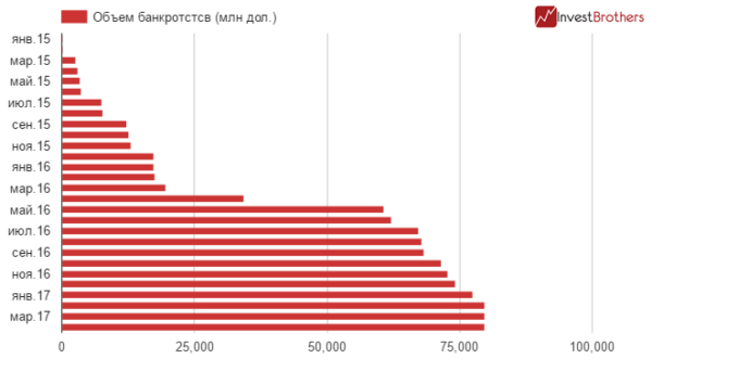 Если сравнивать с показателями прошлого года, то сумма непогашенных долгов оказалось куда более скромной. За четыре месяца 2016 г .объем банкротств достиг 17 млрд долларов.