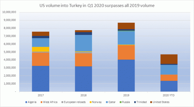 В первом квартале 2020 года объемы закупок сжиженного газа из Соединенных Штатов в Турцию превысили все поставки 2019 года. По данным агентства ICIS, они составили около 1,2 млн тонн (1,62 млрд кубометров). В прошлом году импорт СПГ из США в Турцию не дотянул и до 850 млн кубометров.