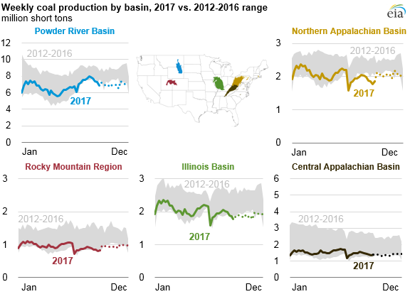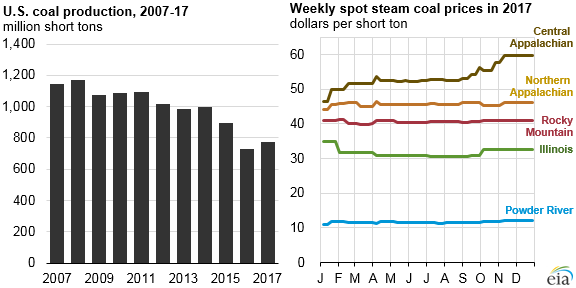 По данным агентства EIA, общий объем добытого угля за 2017 год составил 773 миллиона коротких тонн. Это на 45 миллионов коротких тонн больше, чем в 2016 году и наивысший показатель с 2001 года. В целом по стране выросли цены на уголь, особенно из района центральных Аппалачей. Увеличение спроса на экспорт более чем компенсировало небольшое снижение потребления, что способствовало увеличению добычи в 2017 году.