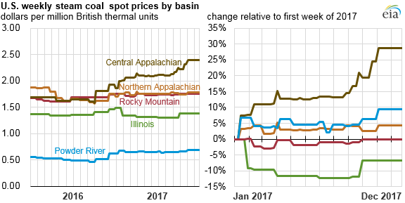 Средняя цена на энергетический уголь в США, в 2017 году увеличилась сразу в нескольких регионах. Цена на уголь из Центральных Аппалачей, обусловленная сильным внутренним и международным спросом, продолжила рост, который начался во второй половине 2016 года, и вырос еще на 29% в 2017 году. Однако цены на уголь в районе Роки Маунтин остались на прежнем уровне, в бассейне реки Иллинойс снизились на 7%.