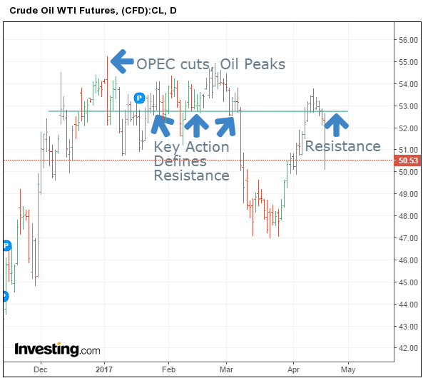 В начале января, когда ОПЕК начала внедрять свое историческое соглашение о сокращении объема добычи нефти, цены на нефть достигли пика выше $55. Мы нарисовали на приведенном выше графике линию сопротивления, которая, как мы заметили, сформировалась на основе ключевого действия. Эта линия на уровне в $52,75 служит критической зоной для прорывов вверх и вниз.