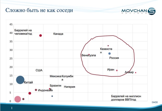 Еще один сложный график. По горизонтали — это количество баррелей нефти, которые тратит страна на миллион долларов в год. То есть, условно говоря, это нефтезависимость. А по вертикали — это количество баррелей, которые добывает страна на человека в год, то есть это нефтебогатство.
