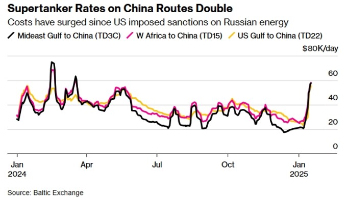 По данным Балтийской биржи, стоимость аренды очень крупных танкеров, которые перевозят сырую нефть по маршруту Ближний Восток — Китай, выросла на 112% за неделю, закончившуюся в пятницу, 10 января. Это произошло после того, как США ввели санкции в отношении почти 160 танкеров, перевозивших российскую нефть.