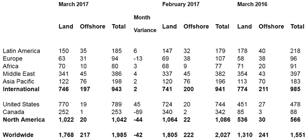 Количество буровых установок во всем мире в марте 2017 года составило 1 985 единиц, что на 42 единицы меньше, чем в феврале 2017 года.