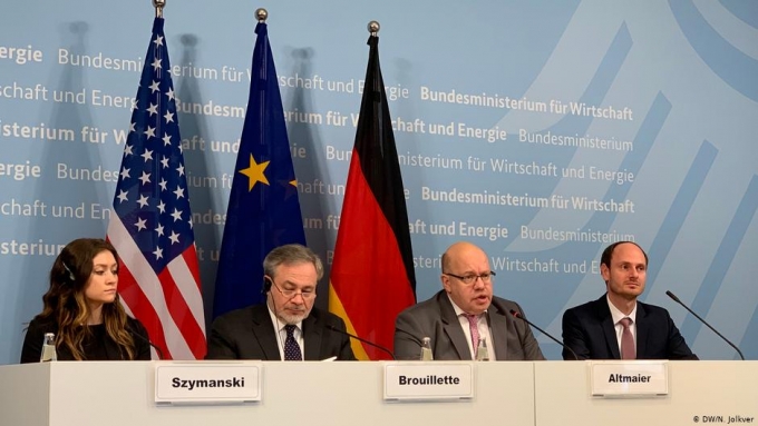 Берлин, 12 февраля 2019: Петер Альтмайер (второй справа) на пресс-конференции с делегацией из США