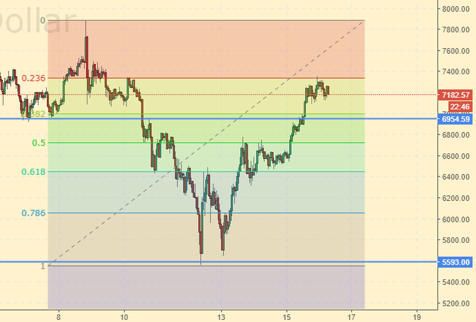 Рынок испытывает терпение медведей и поднялся едва ли не к 7400. Такой ход мы предполагали. Значит, давление покупателей присутствует. Тем не менее, наименее рискованный вариант – это продажа, вплоть до 7550. Если рынок поднимется выше этой отметки, стоит перевернуть мышление и посмотреть вверх. Кто-то уже мечтает о 400 000 долларов за 1 биткоин. Интернет он такой, чего только тут не напишут.
