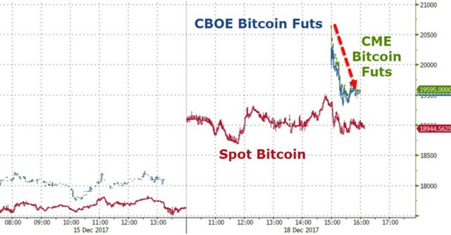 Очередной взлет курса биткоина связывают с началом торгов фьючерсными контрактами на Чикагской товарной бирже CME. Они стартовали сегодня. Кстати, снижение курса началось вскоре после начала торгов срочными контрактами.