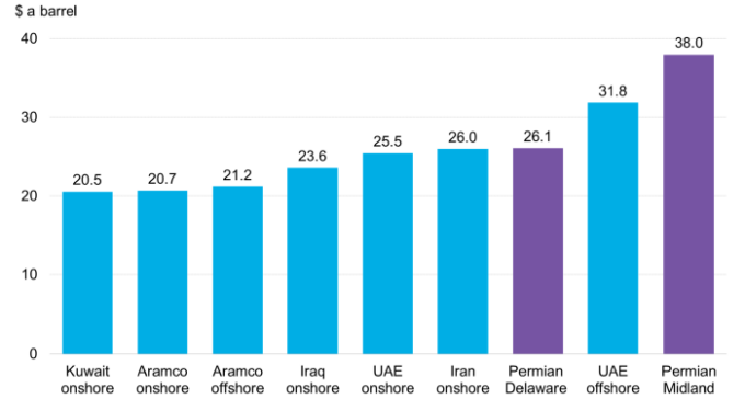 Себестоимость добычи нефти в пяти ближневосточных государствах — Саудовской Аравии, ОАЭ, Кувейте, Иране и Ираке — находится в диапазоне $20–26 за баррель, подсчитали аналитики BloombergNEF. На долю этих производителей приходится свыше половины объема мировых доказанных запасов черного золота.