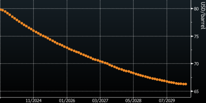 Кривая фьючерсов на нефть Brent находится в крутой бэквордации: ближайшие контракты торгуются в области $80 за баррель, контракты с поставкой в середине 2026 года — в области $72 за баррель, а с поставкой весной 2030 года — в области $66 за баррель (см. ниже).