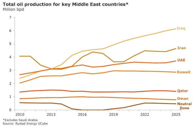 По информации норвежской аналитической компании Rystad Energy, добыча нефти в ближневосточном регионе вырастет на 2,7 млн баррелей в сутки к 2025 г., до примерно 30 млн баррелей н. э. в сутки. Прирост производства нефти обеспечат Ирак (+1,5 млн баррелей в сутки), а также разработка активов в ОАЭ, Иране и нейтральной зоне между Саудовской Аравии и Кувейтом (+1,2 млн баррелей в сутки). Тогда как объемы извлекаемых традиционных запасов нефти за пределами Ближнего Востока продолжат снижаться до 45,6 млн баррелей н. э. в сутки к середине следующего десятилетия, что на 2,3 млн баррелей н. э. ниже современного уровня.