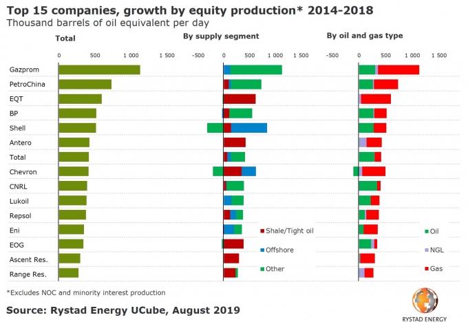 В настоящее время разработка традиционных и сланцевых запасов газа обеспечивает компаниям лидерство среди добывающих углеводороды корпораций. Российский «Газпром», согласно выводам Rystad Energy, продемонстрировал наибольший прирост добычи углеводородного сырья за последние пять лет. Второе место у PetroChina, а третье у разработчика сланцевого газа — американской EQT, которой удалось увеличить добычу с 2014 г. по 2018 г. почти в 3,5 раза. В пятерку крупнейших производителей углеводородов также входят BP и Royal Dutch Shell. Так, результаты BP в значительной степени обеспечены ростом добычи в Ираке и Северной Америке. В десятке крупнейших добывающих корпораций мира отмечены Antero Resources, Total, Chevron, Canadian Natural Resources и еще одна российская компания — ЛУКОЙЛ. Отечественной ВИНК удается наращивать производство как нефти, так и природного газа.