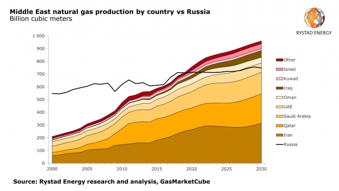 Rystad Energy проанализировала добычу природного газа, оценив потенциал крупнейших регионов и компаний-производителей. Соединенные Штаты остаются безусловным лидером мировой газодобычи. Согласно выводам Rystad Energy, во второй половине 2019 г. ближневосточные страны, объединенные в один газовый регион, могут превзойти Россию по объемам добываемого природного газа. Согласно оценкам Rystad Energy, к 2020 г. на Ближнем Востоке будет производится более 730 млрд куб. м природного газа, а в 2030 г. регион выйдет на уровень добычи более 920 млрд куб. м.