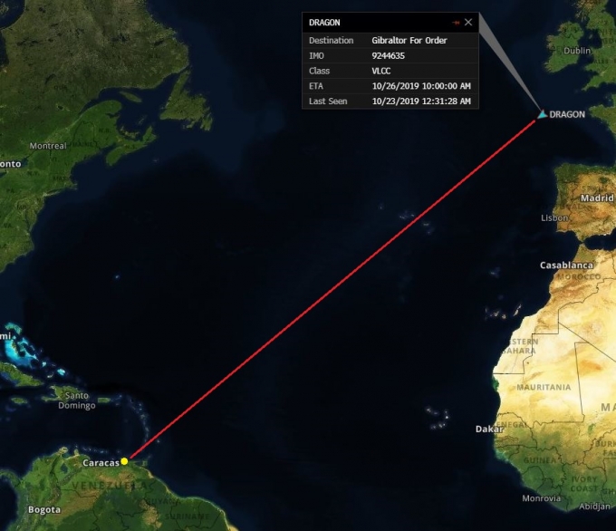 По данным Bloomberg, на один из принадлежащих Венесуэле танкеров Dragon (ходит под флагом Либерии) было отгружено 2 млн баррелей нефти в рамках контракта с «Роснефтью». Сейчас танкер находится неподалеку от Венесуэлы, хотя последний полученный с него GPS-сигнал свидетельствовал, что судно должно быть рядом с побережьем Франции. Агентство также показало предполагаемое местонахождение танкера.