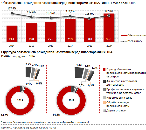 На конец июня текущего года накопленная сумма инвестиций из США в Казахстан (обязательства резидентов Казахстана перед инвесторами из США) составила $ 36 млрд — на 17% больше, чем годом ранее. Максимум средств инвестирован в горнодобывающую промышленность — 94% или $ 33,9 млрд (годом ранее — 91,6% или $ 28,2 млрд).