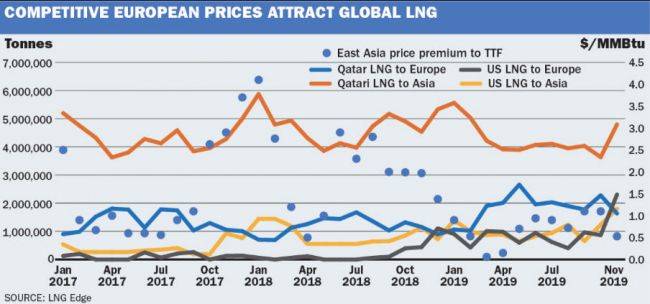 В агентстве S&P Global Platts считают, что Европа стала точкой баланса для глобального рынка СПГ на фоне продолжающейся торговой войны между США и Китаем. На американский СПГ, как известно, Пекин установил экспортные пошлины в 25%, и поставок сжиженного газа из США в Китай практически нет. Кроме того, теплая погода в Азии и все большее использование ядерной энергетики в Японии бьют по самому выгодному рынку так, что Европа стала главной альтернативой.