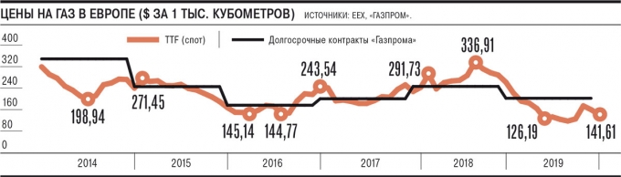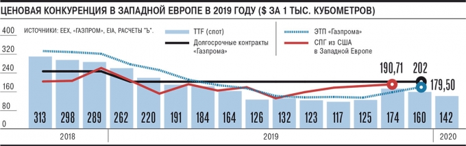 В 2019 году конкуренция между российским трубопроводным газом в Европе и поставщиками сжиженного газа невероятно обострилась. Это привело к падению цен до самого низкого уровня в истории современной европейской газовой отрасли — в сентябре 2019 года средняя спотовая цена на ключевом хабе TTF в Нидерландах снижалась до $117 за 1 тыс. кубометров. Затем цены немного восстановились из-за опасения прерывания транзита газа через Украину, так как контракт между «Газпромом» и «Нафтогазом Украины» истекал 1 января. Но поскольку Россия и Украина смогли договориться о продолжении транзита, в январе цены вновь начали снижаться и в разгар зимы уже тестируют минимумы лета прошлого года.