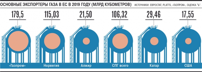 С точки зрения объемов «Газпром» в 2019 году смог даже немного увеличить поставки в ЕС, на 1,5%, до 180 млрд кубометров (по российским стандартам учета при 20° и калорийности 8850 килокалорий на кубометр). Тем не менее его доля в импорте в ЕС сократилась до 42,5% благодаря росту поставок СПГ до 106 млрд кубометров. Другие экспортеры трубопроводного газа в Европу — Норвегия и Алжир — в отличие от «Газпрома», сократили поставки в 2019 году.