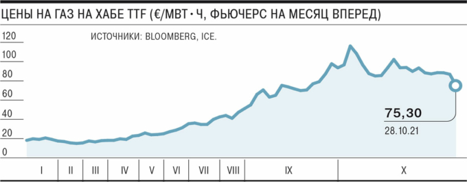 Форвардные цены на газ в Европе откатились к уровню месячной давности по мере того, как трейдеры закладывают в котировки эффект от роста поставок от «Газпрома» в ноябре, обещанных 27 октября президентом Владимиром Путиным. Ноябрьский фьючерс на индекс TTF потерял 28 октября почти 14%, упав до €75 за 1 МВт•ч (около $940 за тысячу кубометров). Это самое большое дневное снижение за месяц, если не считать внутридневных колебаний 6 октября, когда в ходе торгов цена превышала $1,9 тыс. за тысячу кубометров, а затем упала до $1,2 тыс. за тысячу кубометров.