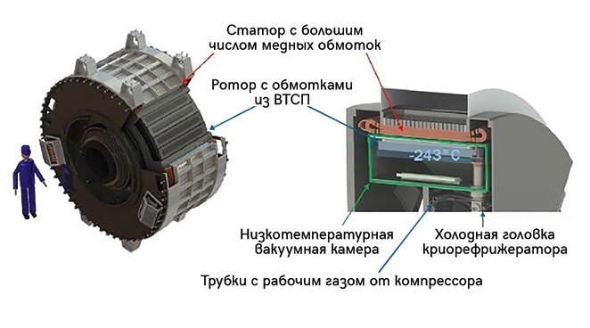 Разработчики применили в роторе ленты ВТСП из оксидов гадолиния, бария и меди, что позволило упростить систему охлаждения. Вместо множества мелких криостатов смонтирован один большой (см. рис. 2). Рядом с генератором находится компрессор криохолодильника. Газ от него поступает в ротор через герметичное вращающееся сочленение.