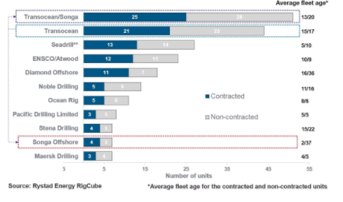 Исключая новые единицы, средний возраст буровых установок компании Transocean/Songa составляет около 13 лет. Согласно базе Rystad Energy’s RigCube, объеднинение компаний обеспечит 90 лет эксплуатации по сравнению с оффшорами Seadrill и Diamond, где срок эксплуатации составит 25 лет.