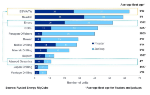 Исключая новые единицы, средний возраст плавучих средств компаний Ensco/Atwood меньше 10 лет, средний возраст объединенных буровых установок около 20 лет. Согласно базе Rystad Energy’s RigCube, срок суммарный срок службы двух компаний около 50 лет.