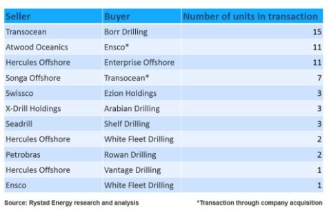 В таблице 1 представлен обзор всех 59 сделок, которые произошли в 2017 году. Отчуждение стационарных буровых установок компании Transocean компании Borr Drilling по-прежнему является сделкой объединения на текущий момент. Второй по величине сделкой является поглощение компанией Ensco компании Atwood (11 единиц). В то же время сделка Hercules/Enterprise (которая также насчитывает 11 единиц) является результатом прошедшего аукциона по банкротству. Очевидно, что владельцы буровых платформ приспосабливают себя к изменениям на рынке и мы ожидаем большей активности от них в процессе слияний и поглощений, продаже буровых.