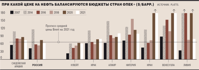 С другой стороны, текущие цены на нефть, хотя и довольно высокие по сравнению с уровнем 2020 года, не позволяют большинству стран ОПЕК+, в том числе Саудовской Аравии, сбалансировать свои бюджеты (см. инфографику). Этот фактор будет сдерживать желание стран альянса увеличивать квоты, если это приведет к снижению нефтяных котировок.